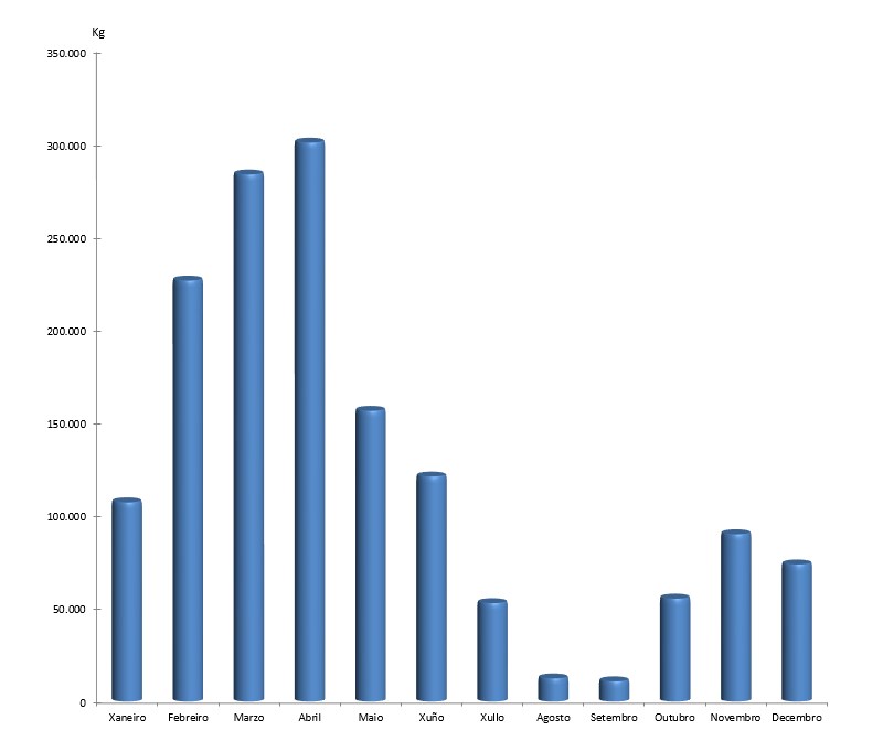 | Ovas de pescada | 24.653 | 24.560 | 27.980 | 32.658 | 31.465 | 22.891 | 14.630 | 7.465 | 4.435 | 3.671 | 5.551 | 12.277 | 212.235 |