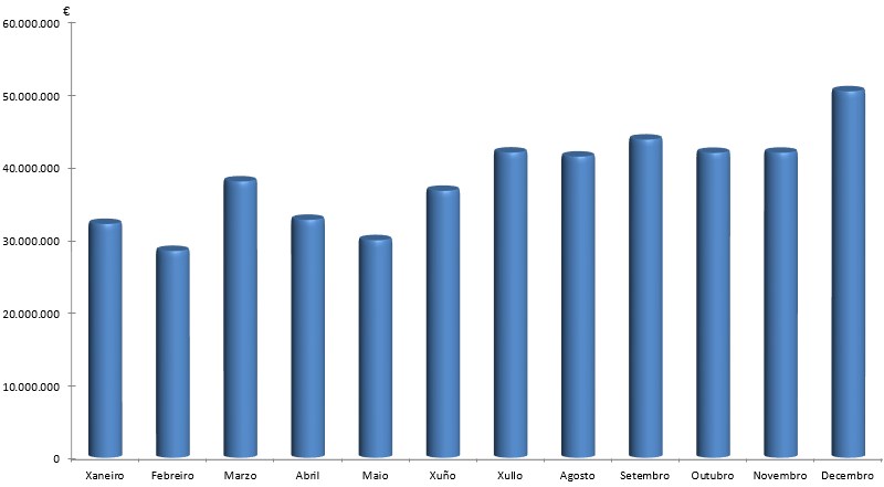 | Xaneiro | Febreiro | Marzo | Abril | Maio | Xuño | Xullo | Agosto | Setembro | Outubro | Novembro | Decembro | Total | |