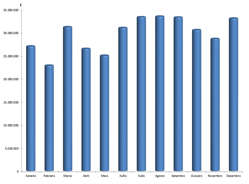 | Xaneiro | Febreiro | Marzo | Abril | Maio | Xuño | Xullo | Agosto | Setembro | Outubro | Novembro | Decembro | Total | |
