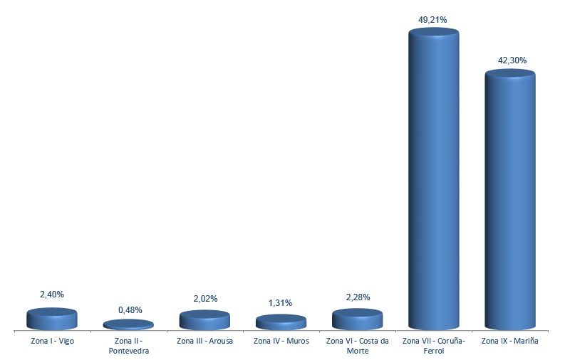 | Zona II - Pontevedra | 95 | 16.010 | 0,48% | 66.036 | 1,29% | 4,12 |