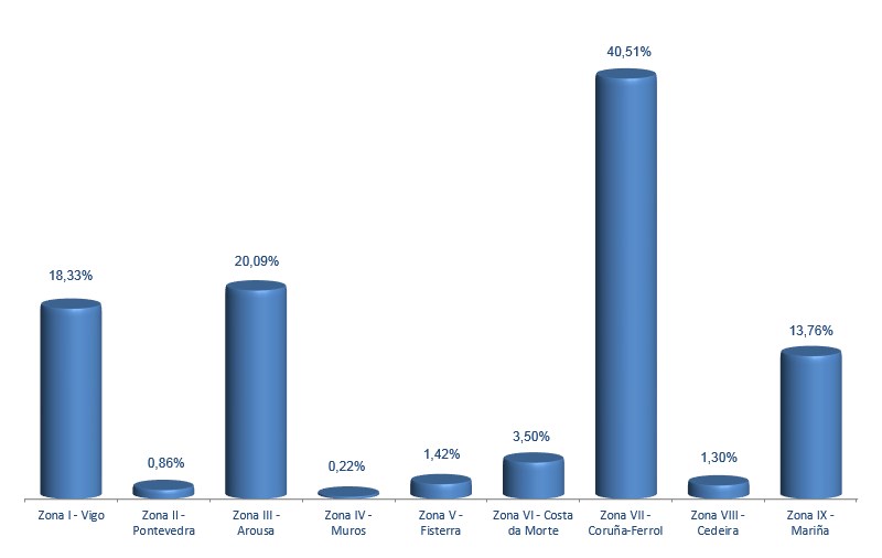 | Zona VI - Costa da Morte | 230 | 66.418 | 3,50% | 83.899 | 2,66% | 1,26 |