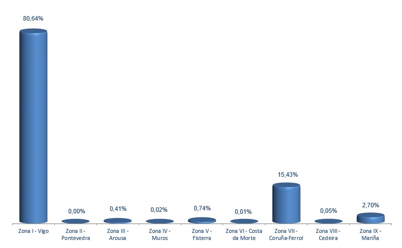 | Zona VI - Costa da Morte | 52 | 429 | 0,01% | 3.505 | 0,01% | 8,18 |
