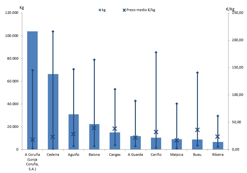 | A Coruña (Lonja Coruña, S.A.) | 240 | 103.798 | 33,03% | 1.848.241 | 24,50% | 17,81 |