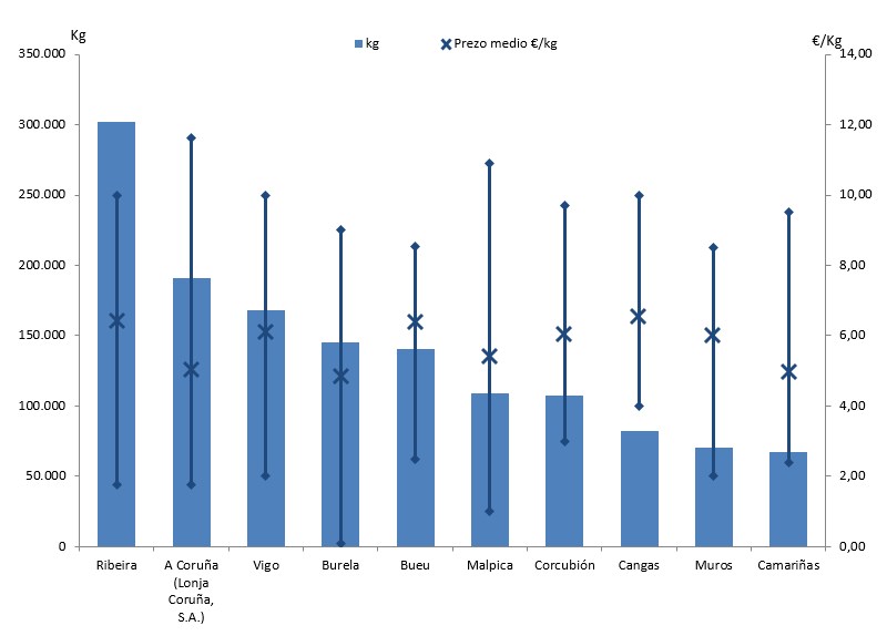 | A Coruña (Lonja Coruña, S.A.) | 230 | 191.195 | 10,80% | 961.294 | 9,41% | 5,03 |