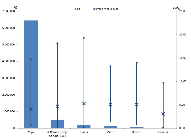 | A Coruña (Lonja Coruña, S.A.) | 279 | 516.238 | 6,96% | 2.419.206 | 7,76% | 4,69 |