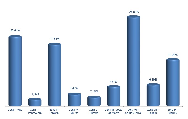 | Zona VI - Costa da Morte | 246 | 17.550 | 5,74% | 238.215 | 5,95% | 13,57 |