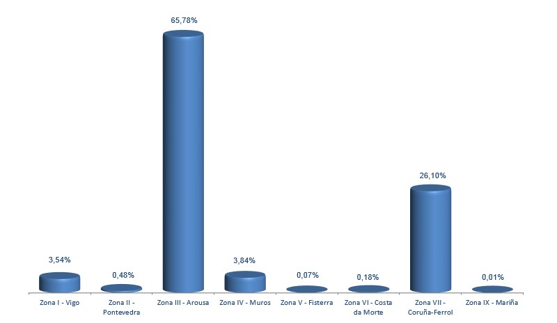 | Zona III - Arousa | 253 | 710.060 | 65,78% | 9.599.420 | 70,12% | 13,52 |