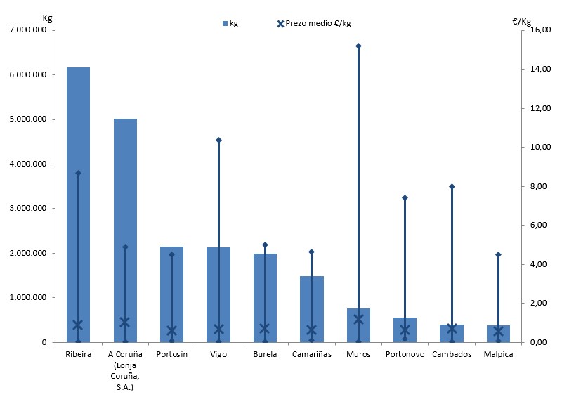 | A Coruña (Lonja Coruña, S.A.) | 257 | 5.023.339 | 22,87% | 5.175.757 | 28,21% | 1,03 |