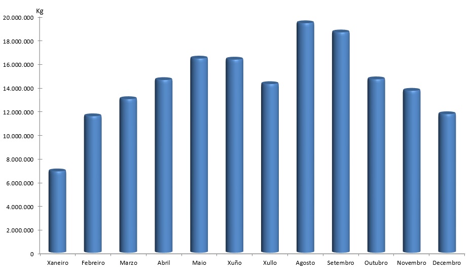 | Sardiña | 1.720 | 2.127 | 185.487 | 114.841 | 396.898 | 798.779 | 792.926 | 789.265 | 1.083.274 | 177.941 | 29.357 | 2.122 | 4.374.736 |