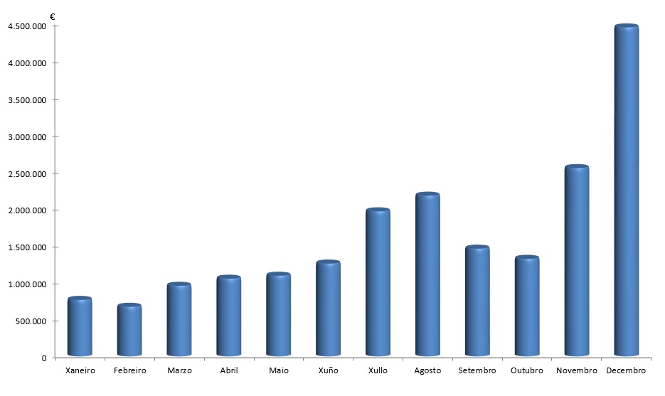 | Xaneiro | Febreiro | Marzo | Abril | Maio | Xuño | Xullo | Agosto | Setembro | Outubro | Novembro | Decembro | Total | |