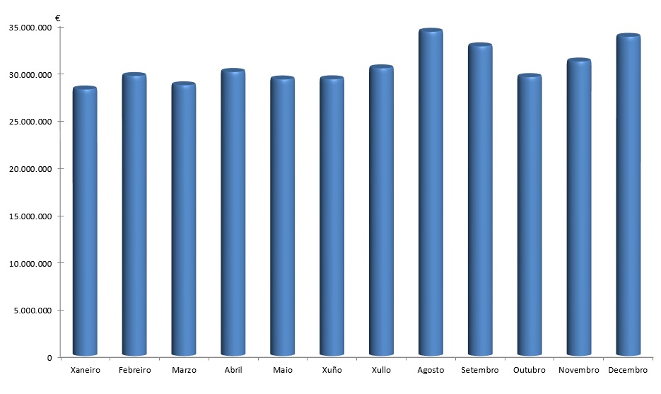 | Xaneiro | Febreiro | Marzo | Abril | Maio | Xuño | Xullo | Agosto | Setembro | Outubro | Novembro | Decembro | Total | |