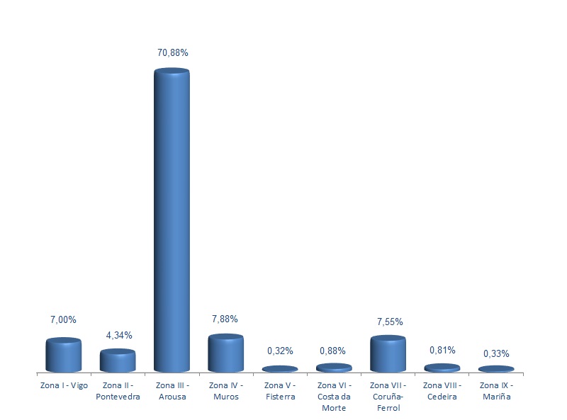 | Zona VI - Costa da Morte | 53 | 3.358 | 0,88% | 94.138 | 0,84% | 28,04 |