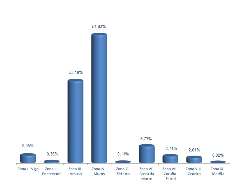 | Zona VI - Costa da Morte | 149 | 136.541 | 6,73% | 814.774 | 8,75% | 5,97 |