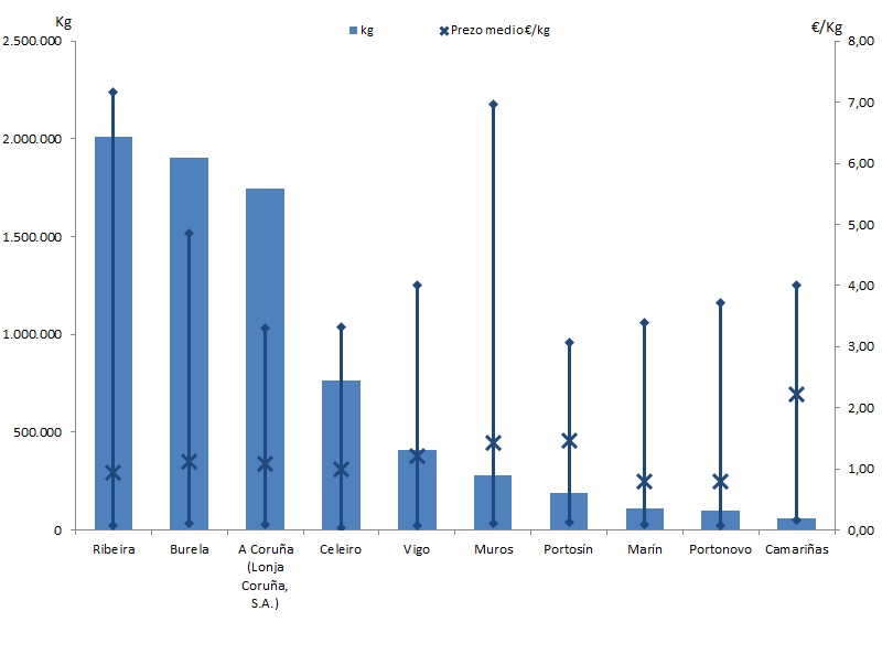 | A Coruña (Lonja Coruña, S.A.) | 237 | 1.748.692 | 22,71% | 1.902.322 | 22,83% | 1,09 |