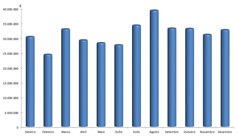 | Xaneiro | Febreiro | Marzo | Abril | Maio | Xuño | Xullo | Agosto | Setembro | Outubro | Novembro | Decembro | Total | |