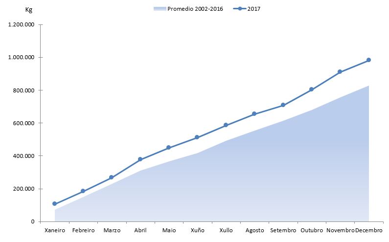 | Bivalvos | 62.362 | 519.772 | 47.015 | 407.320 | 15.347 | 112.453 | 32,64% | 27,61% |