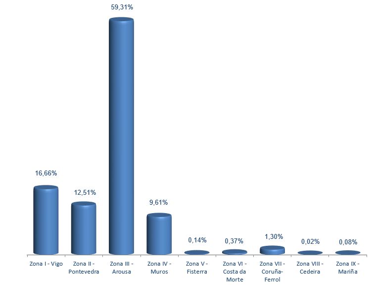 | Zona VI - Costa da Morte | 89 | 12.192 | 0,37% | 94.689 | 0,34% | 7,77 |