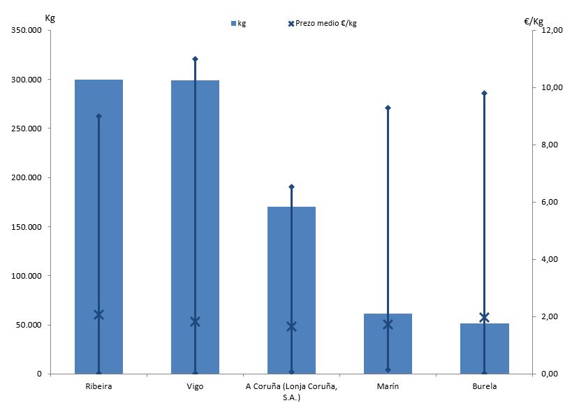 | A Coruña (Lonja Coruña, S.A.) | 252 | 170.223 | 15,10% | 281.712 | 12,99% | 1,65 |