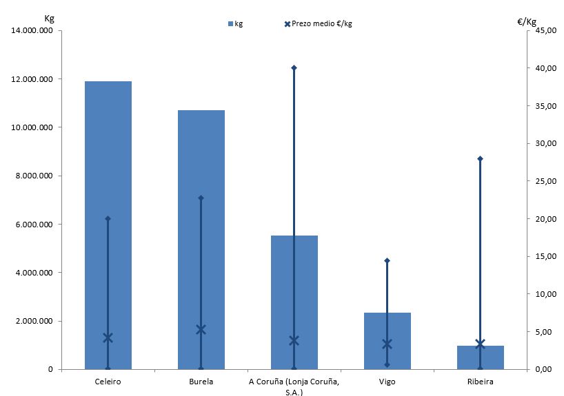| A Coruña (Lonja Coruña, S.A.) | 303 | 5.535.229 | 17,07% | 21.117.113 | 14,85% | 3,82 |