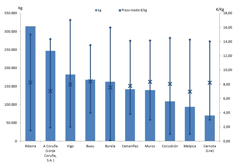 | A Coruña (Lonja Coruña, S.A.) | 216 | 246.524 | 12,15% | 1.728.168 | 10,85% | 7,01 |