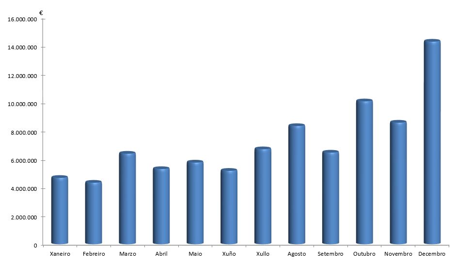| Xaneiro | Febreiro | Marzo | Abril | Maio | Xuño | Xullo | Agosto | Setembro | Outubro | Novembro | Decembro | Total | |