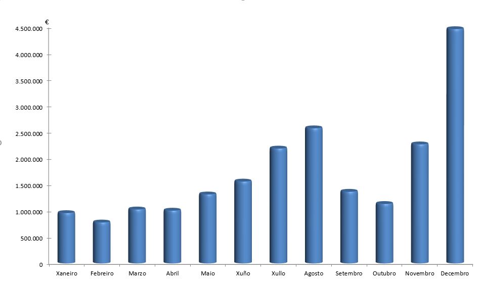 | Xaneiro | Febreiro | Marzo | Abril | Maio | Xuño | Xullo | Agosto | Setembro | Outubro | Novembro | Decembro | Total | |