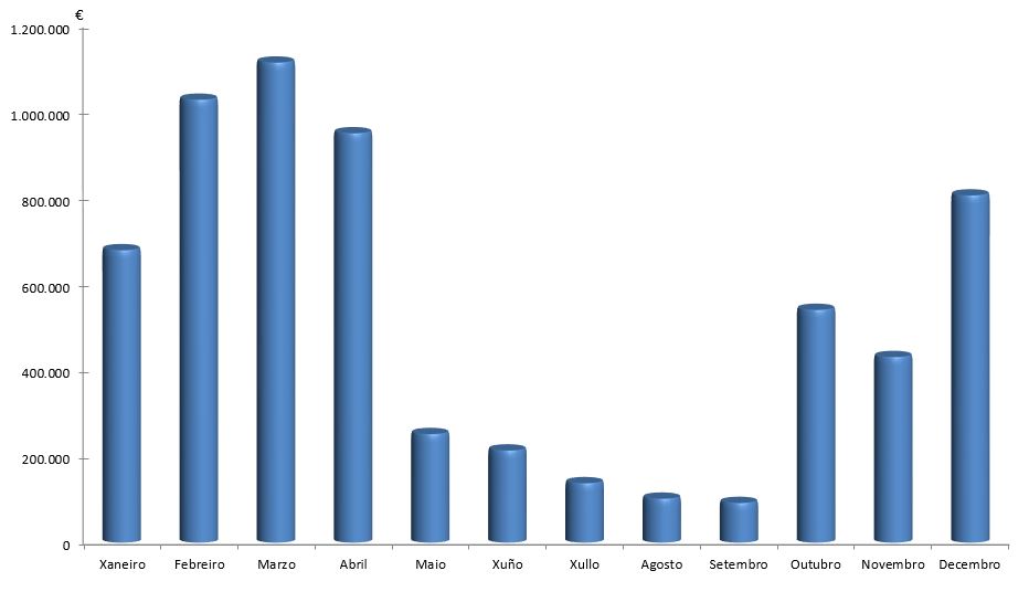 | Xaneiro | Febreiro | Marzo | Abril | Maio | Xuño | Xullo | Agosto | Setembro | Outubro | Novembro | Decembro | Total | |