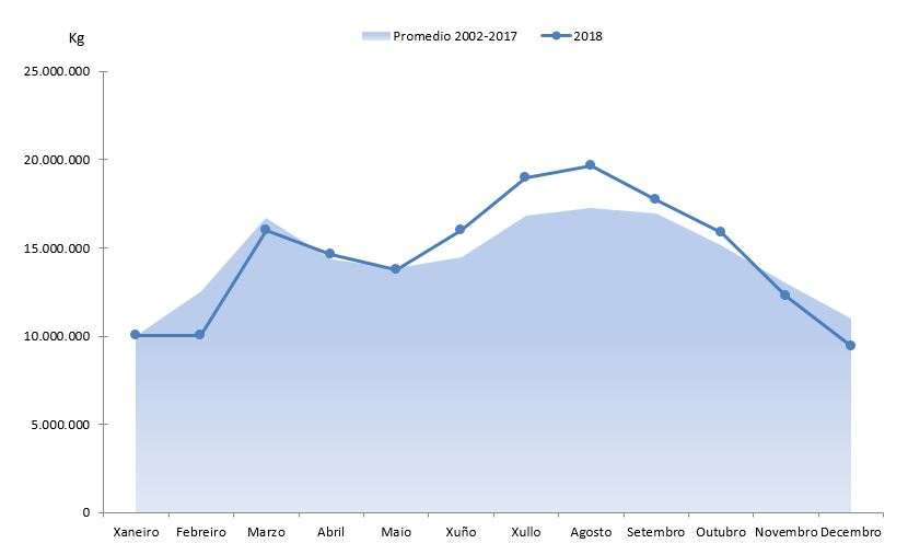 | Xaneiro | 10.010.969 | 38.618.737 | 11.297.241 | 38.714.502 | -1.286.272 | -95.766 | -11,39% | -0,25% |
