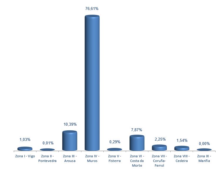 | Zona V - Fisterra | 54 | 7.150 | 0,29% | 27.873 | 0,18% | 3,90 |