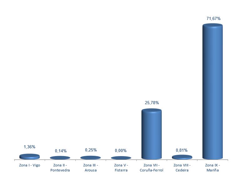 | Zona VIII - Cedeira | 6 | 13.281 | 0,81% | 73.696 | 1,08% | 5,55 |