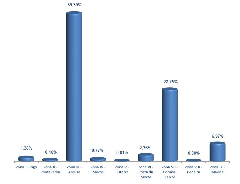 | Zona V - Fisterra | 74 | 1.310 | 0,01% | 2.141 | 0,01% | 1,64 |