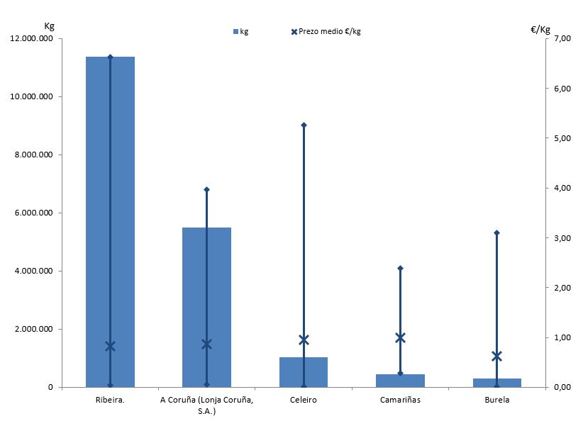 | A Coruña (Lonja Coruña, S.A.) | 254 | 5.500.696 | 28,75% | 4.719.625 | 29,55% | 0,86 |