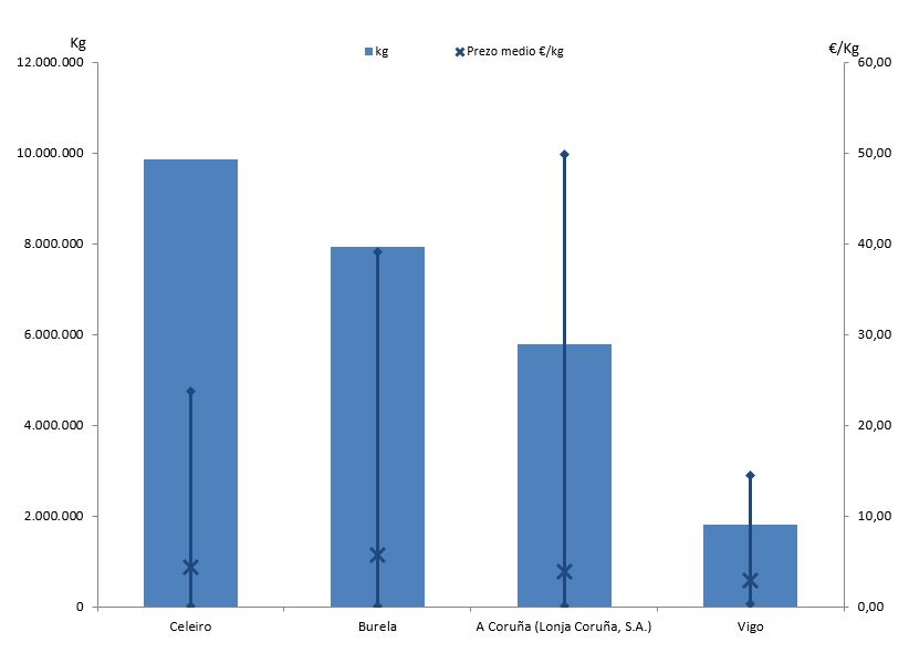| A Coruña (Lonja Coruña, S.A.) | 307 | 5.796.991 | 20,87% | 22.394.014 | 18,06% | 3,86 |