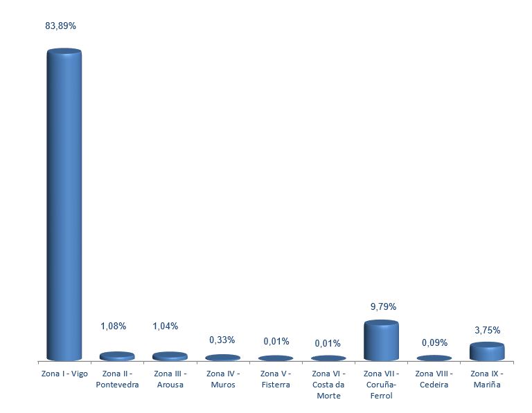 | Zona V - Fisterra | 125 | 684 | 0,01% | 4.582 | 0,02% | 6,70 |
