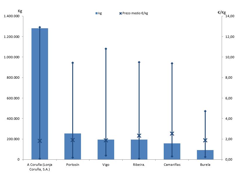 | A Coruña (Lonja Coruña, S.A.) | 65 | 1.281.290 | 51,54% | 2.325.122 | 48,04% | 1,81 |
