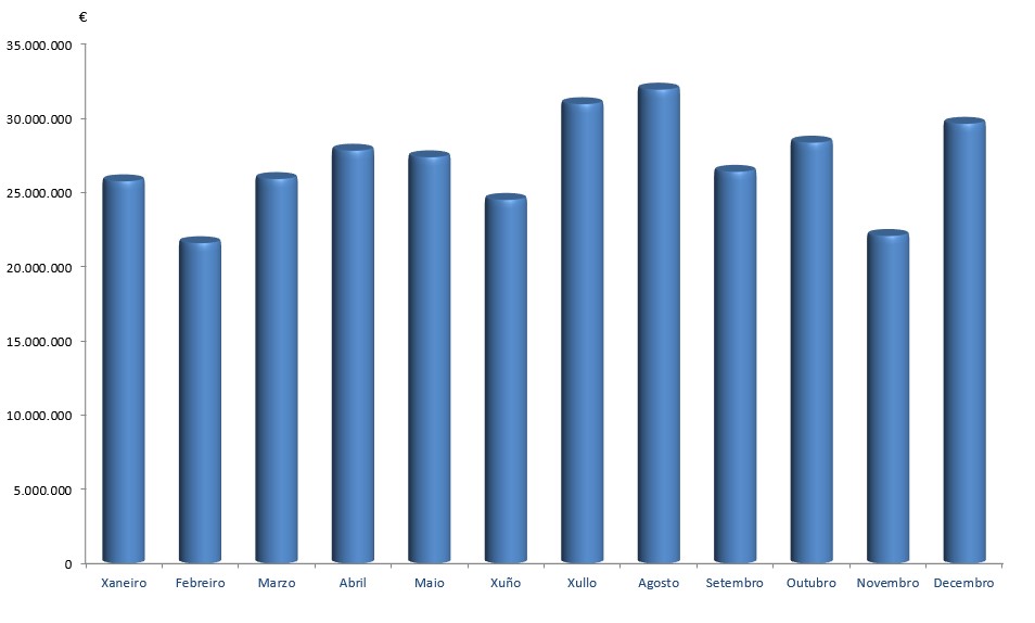 | Xaneiro | Febreiro | Marzo | Abril | Maio | Xuño | Xullo | Agosto | Setembro | Outubro | Novembro | Decembro | Total | |
