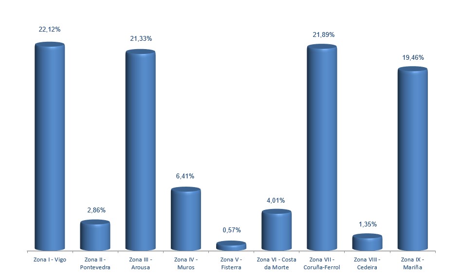 | Zona V - Fisterra | 894.806 | 0,57% | 5.338.597 | 1,15% | 5,97 |
