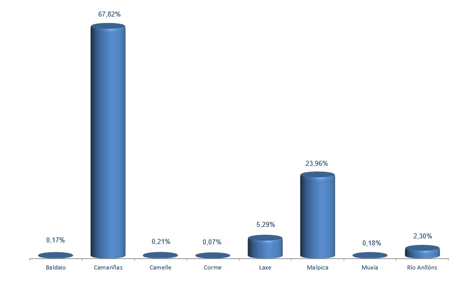 | Muxía | 11.565 | 0,18% | 83.584 | 0,81% | 7,23 |