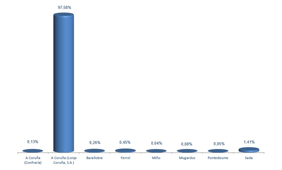 | A Coruña (Lonja Coruña, S.A.) | 33.780.333 | 97,58% | 69.135.507 | 95,14% | 2,05 |