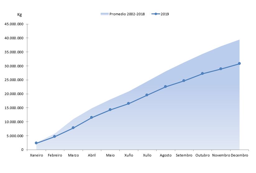 | Crustáceos | 50.239 | 843.766 | 47.699 | 785.504 | 2.540 | 58.261 | 5,33% | 7,42% |
