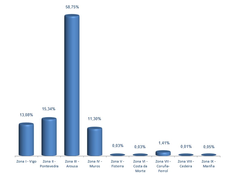 | Zona VI - Costa da Morte | 29 | 1.060 | 0,03% | 9.767 | 0,03% | 9,21 |