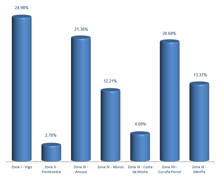 | Zona I - Vigo | 44 | 433.393 | 24,98% | 935.874 | 25,02% | 2,16 |
