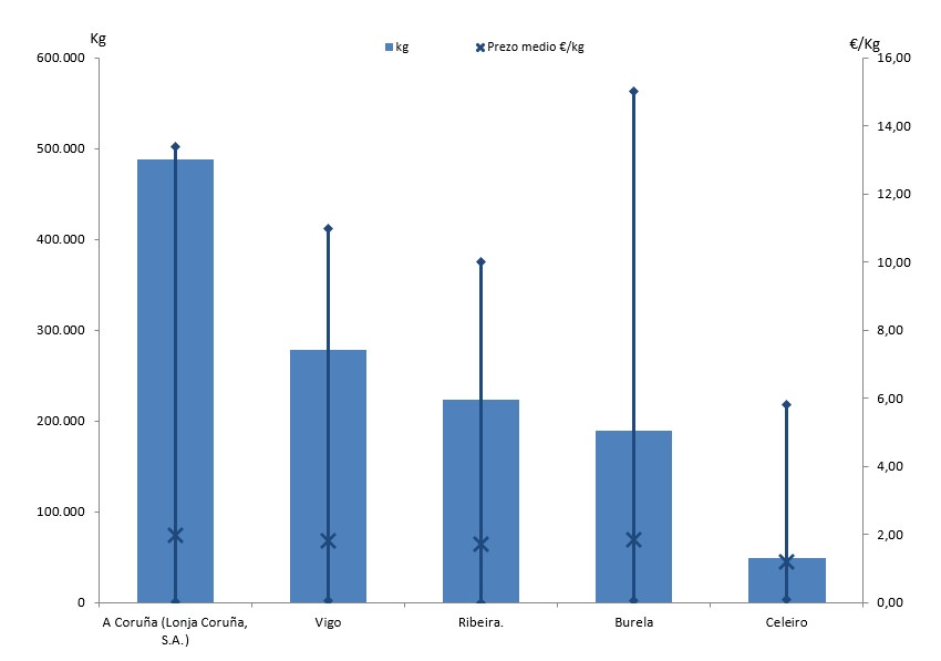 | A Coruña (Lonja Coruña, S.A.) | 265 | 487.745 | 36,73% | 963.892 | 40,01% | 1,98 |