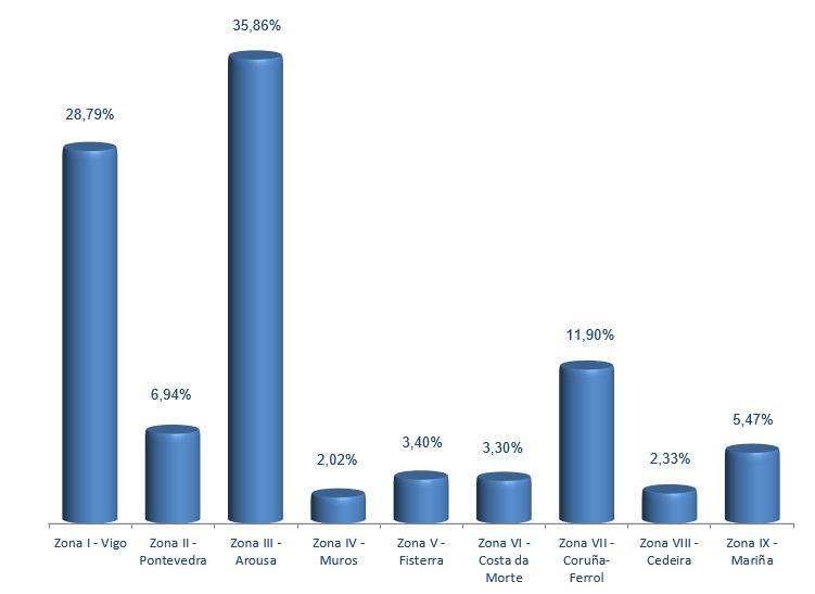 | Zona VI - Costa da Morte | 243 | 28.331 | 3,30% | 71.653 | 3,96% | 2,53 |