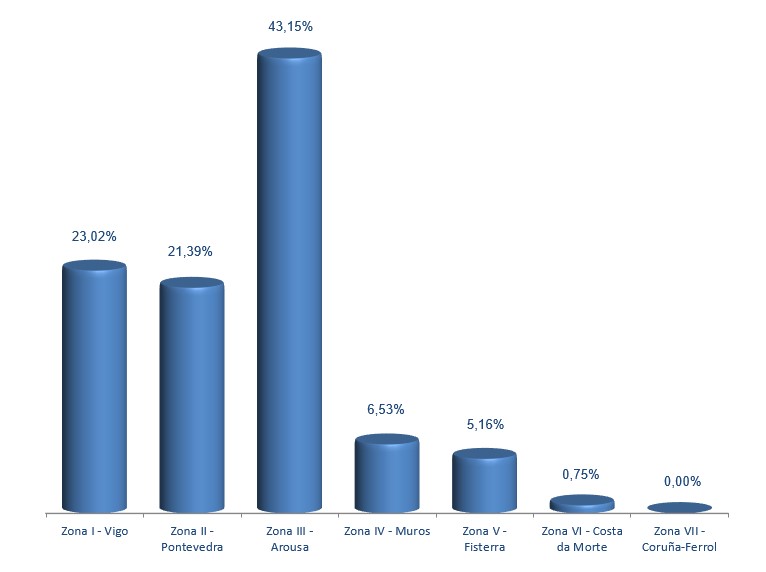 | Zona III - Arousa | 250 | 240.709 | 43,15% | 2.599.522 | 42,88% | 10,80 |