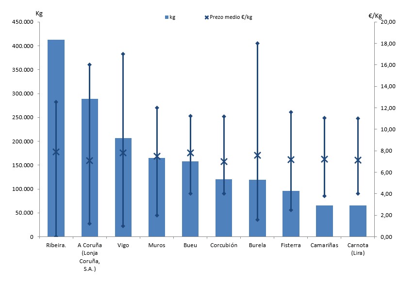 | A Coruña (Lonja Coruña, S.A.) | 221 | 289.225 | 13,58% | 2.052.968 | 12,82% | 7,10 |