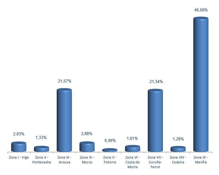 | Zona VI - Costa da Morte | 174 | 96.223 | 1,61% | 128.724 | 1,36% | 1,34 |