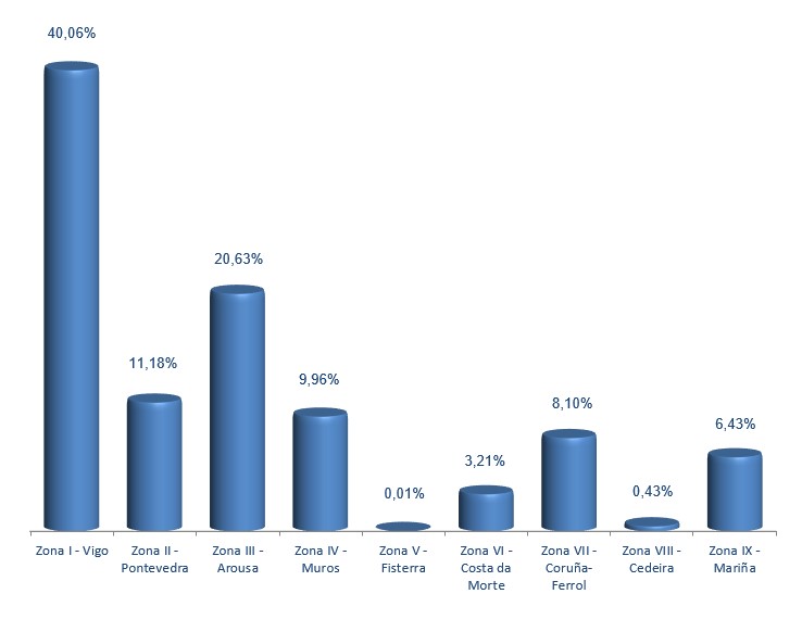 | Zona VI - Costa da Morte | 113 | 322.026 | 3,21% | 255.249 | 4,63% | 0,79 |