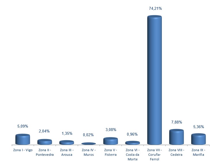 | Zona VI - Costa da Morte | 204 | 10.391 | 0,96% | 57.906 | 0,87% | 5,57 |