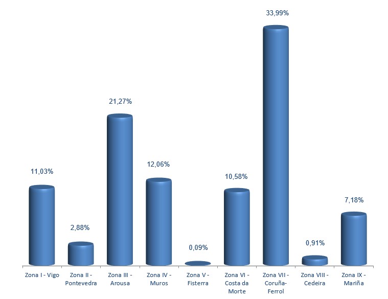 | Zona VI - Costa da Morte | 242 | 4.081.749 | 10,58% | 2.815.044 | 10,15% | 0,69 |